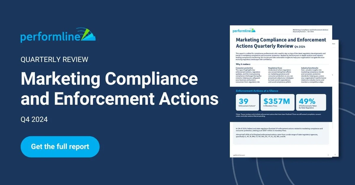 During my time at PerformLine, I designed and contributed to a series of statical reports that focused on trends in the marketing compliance and regulatory space. The report showcased below is the 2025 Marketing Compliance and Enforcement Actions report. This report is a part of a series of reports that was typically released quarterly highlighting different enforcement actions taken by state and federal regulators. This report covers the first half of 2025 of where regulators were focusing their efforts, and what marketing compliance trends were being seen across the industry. For this project, I designed the report along with promotional material to be posted on social media.